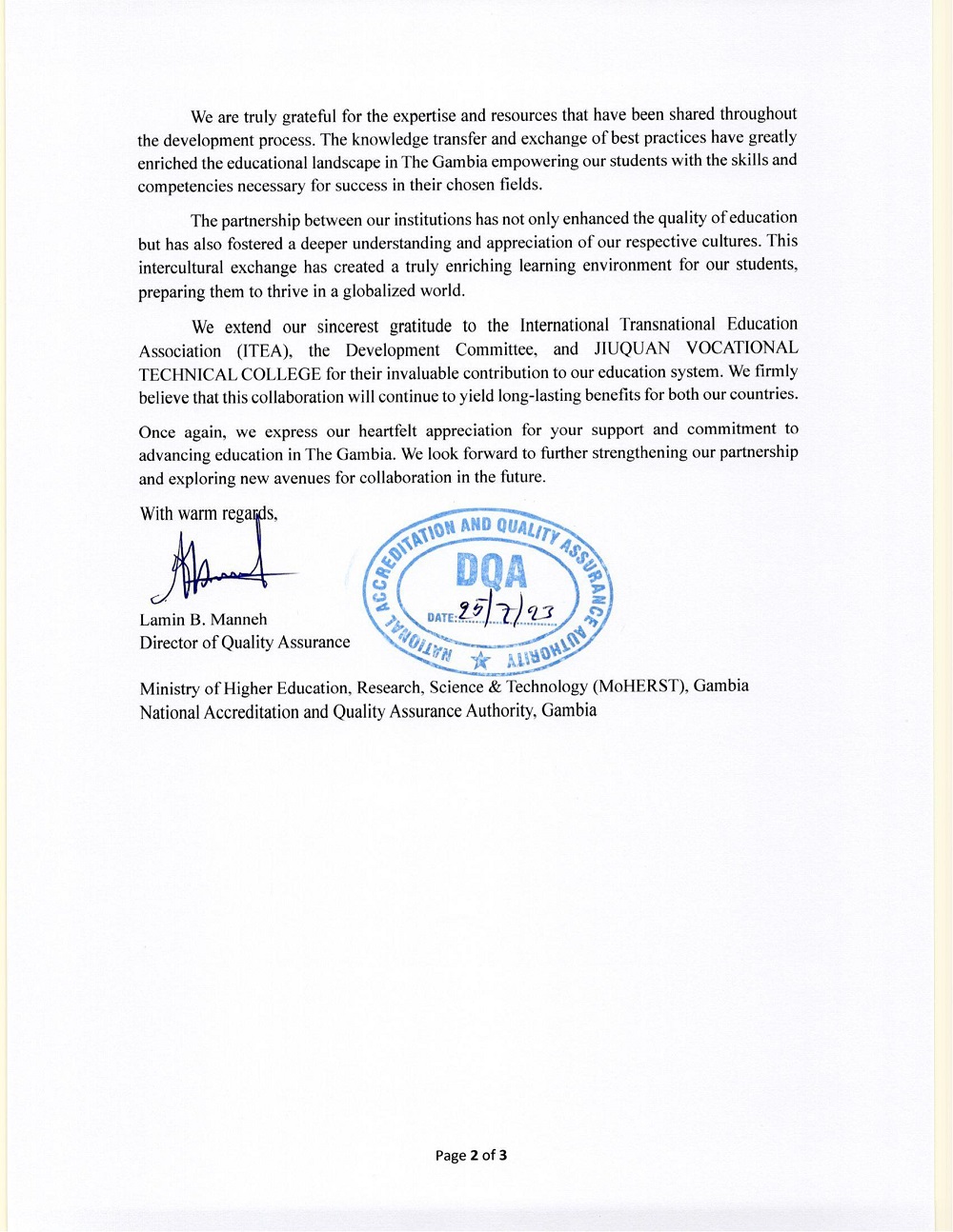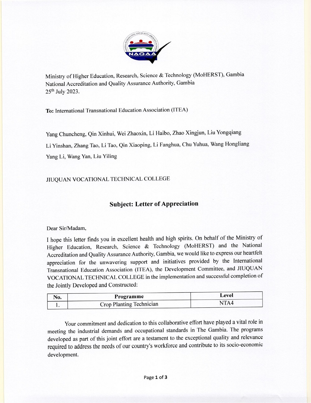 我院承建的冈比亚农作物种植技术员NTA4国家职业标准顺利通过冈比亚教育部国家认证与质量保证部注册认证并纳入冈比亚国家职业教育体系。