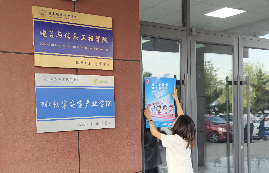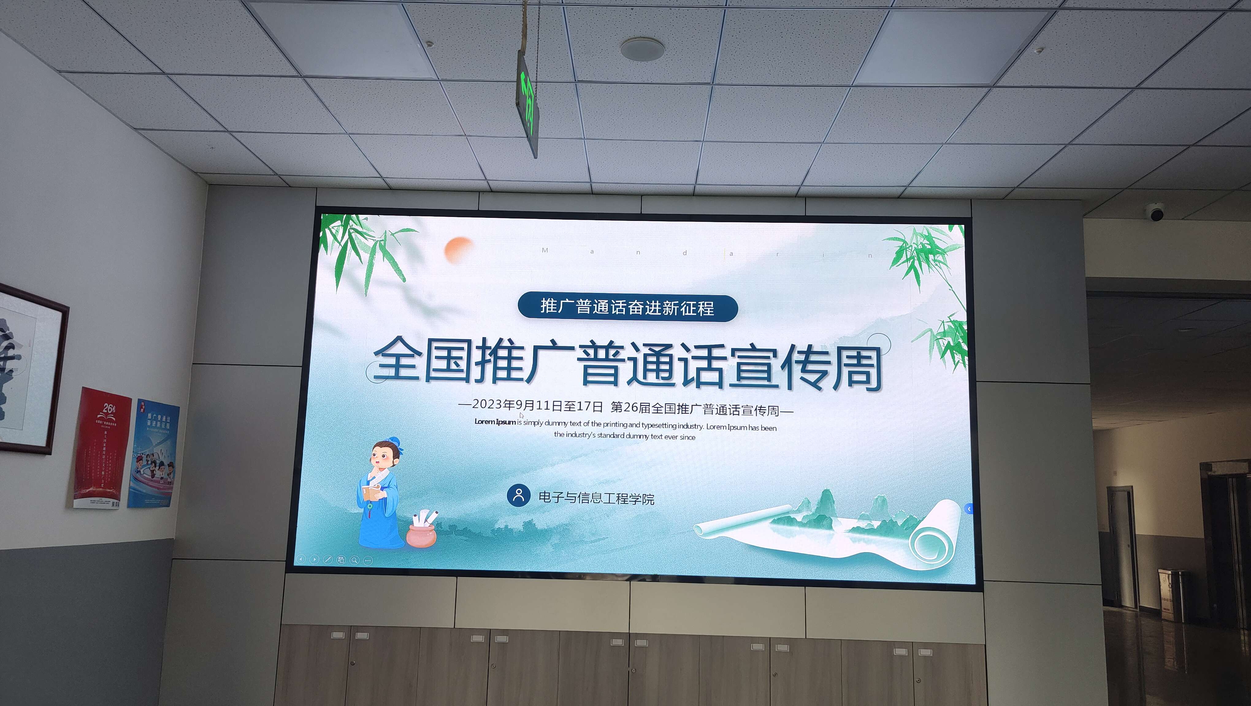 同时在弘毅楼B座一楼大厅电子显示屏发布推普公益宣传标语、宣传视频;在教室、楼道处张贴以宣传推广普通话为主题的宣传画和宣传横幅。
