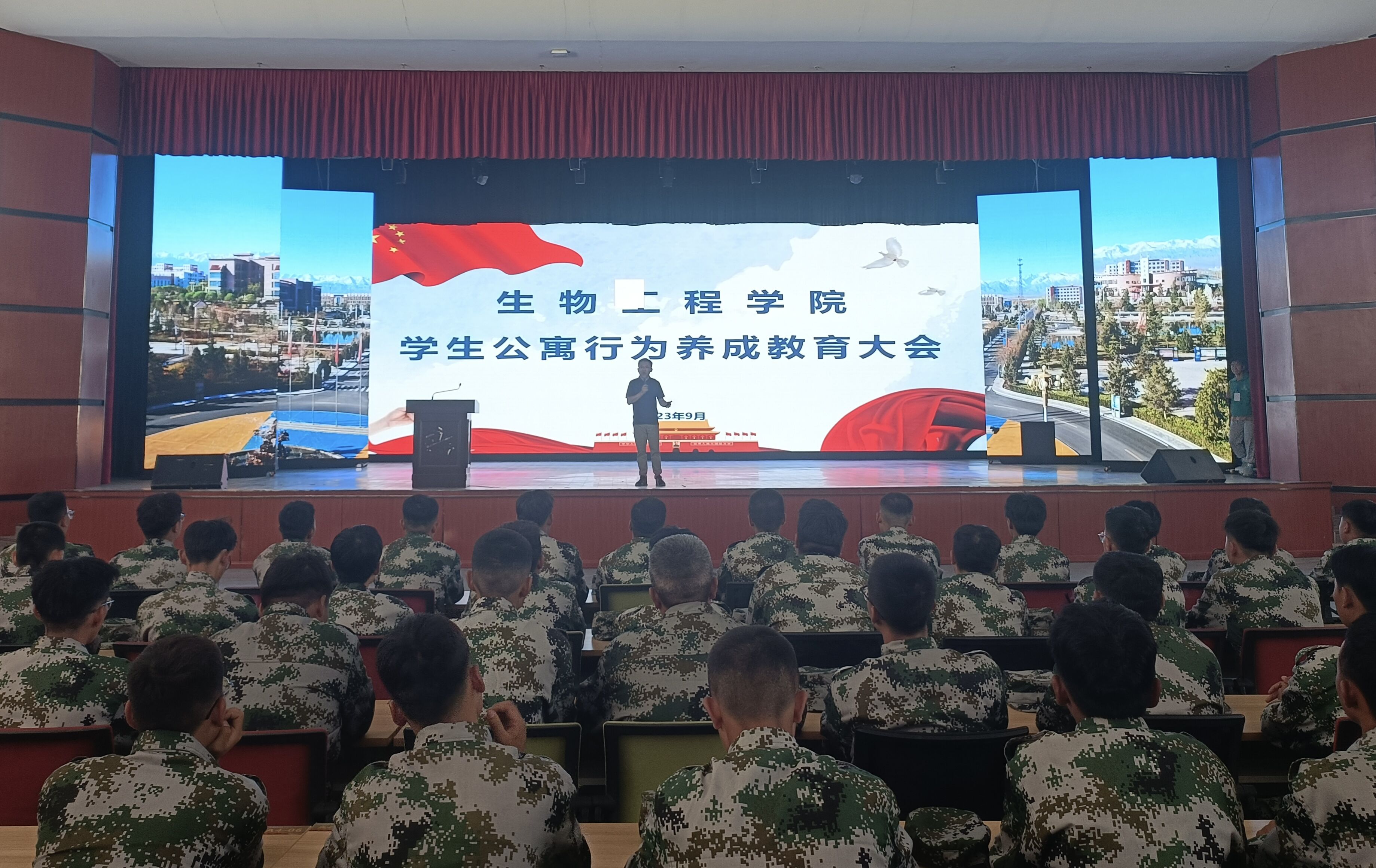 为了培养学生良好的生活习惯,创设卫生、文明、整洁的宿舍生活环境,养成严谨、规范的作风,积极推进宿舍管理的精致化。9月14日,生物工程学院在胡杨文化活动中心召开学生公寓行为养成教育大会,庞捷副院长主持,全体男生参加。