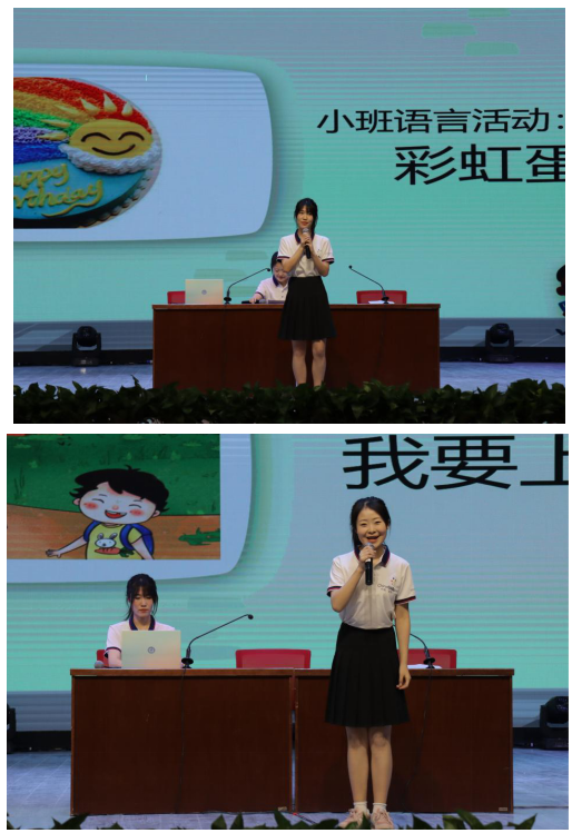 在经验交流过程中,闫婷同学首先分享了参赛前的日常备赛和训练经历,介绍了团队的学习经验,并表达了对学院和指导教师的感激之情。薛春娟同学和闫婷同学分别以“小班幼儿活动:彩虹蛋糕”和“大班综合活动:我要上小学了”向在座师生现场演示了幼儿教育技能赛项比赛中具体活动如何展开。