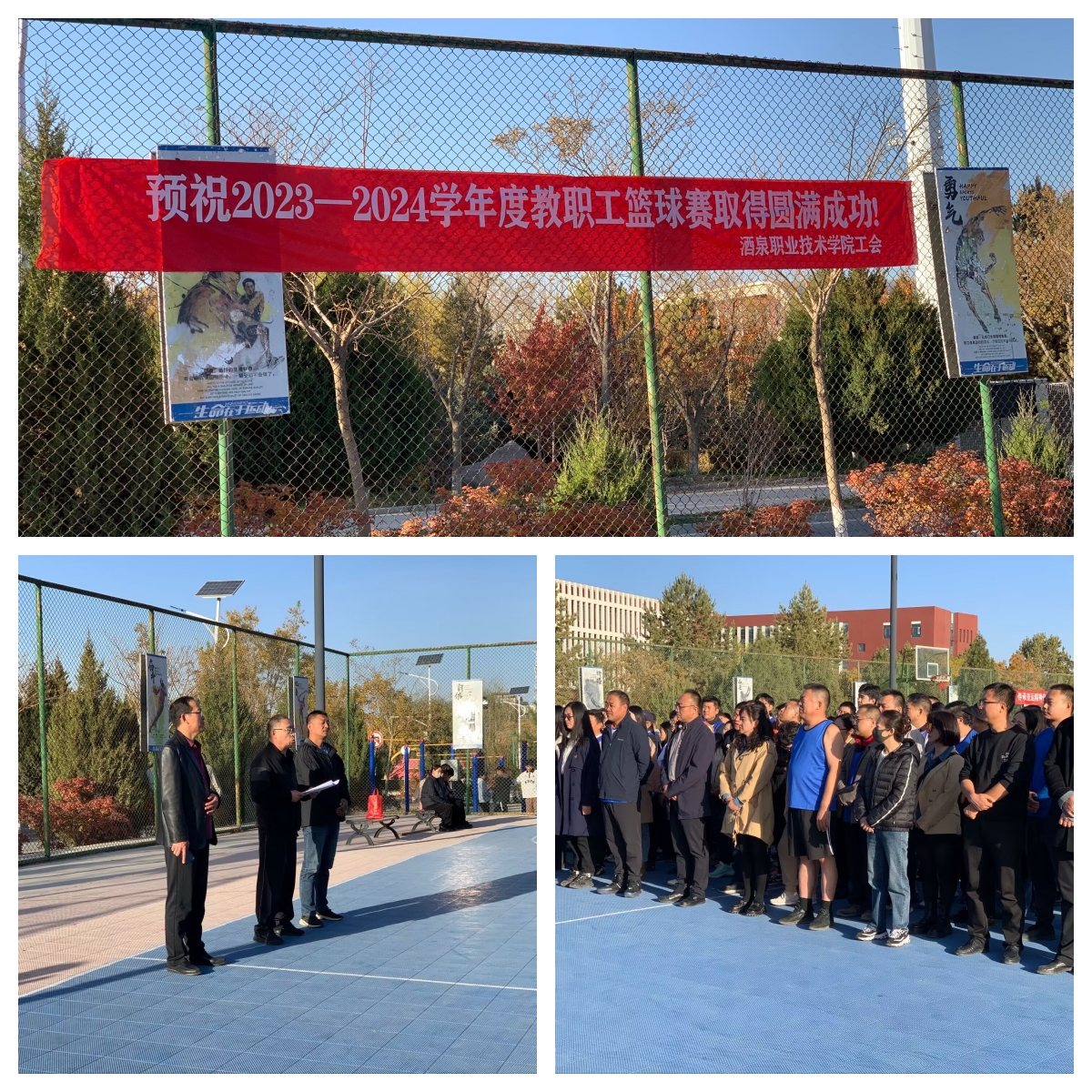 10月31日,由校工会主办,体育与健康学院承办的酒泉职业技术学院2023-2024学年教职工篮球赛,在逸夫楼西侧篮球场拉开帷幕。学校党委副书记许军、工会主席刘方、体育与健康学院党支部书记周小刚、体育与健康学院党支部副书记马鑫及全体裁判员、运动员参加开幕式。