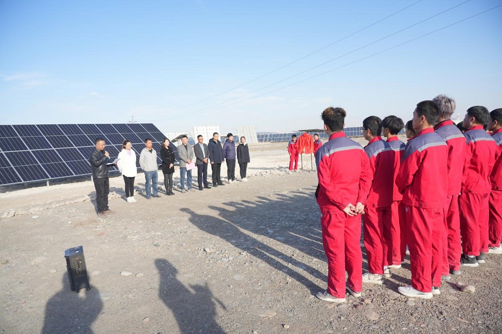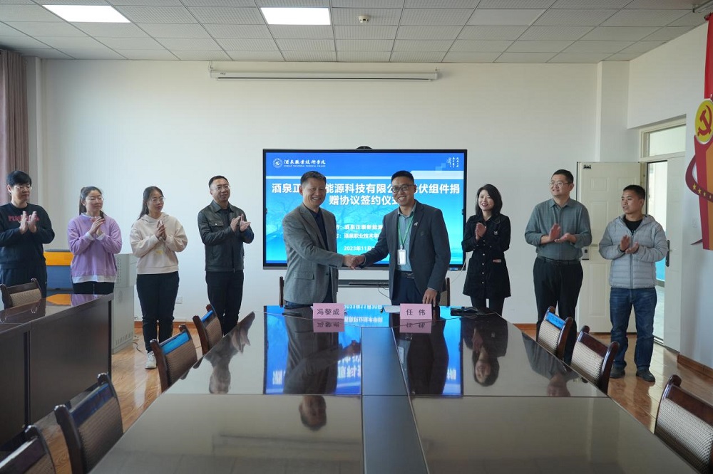 2023年11月20日下午,酒泉职业技术学院新能源工程学院在国家级10.1MW光伏发电生产性实训基地现场隆重举行酒泉正泰新能源科技有限公司光伏组件捐赠仪式。酒泉正泰新能源科技有限公司总经理任伟、人事经理李娜、学校党委委员办公室主任新能源工程学院党支部书记院长冯黎成及学院领导、教师和学生代表到场参加。