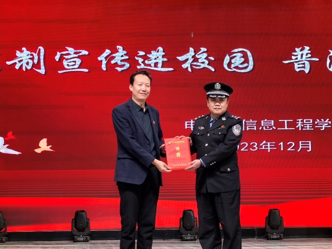 学院党支部书记、院长武兴宝教授代表学校为殷明亮书记颁发了法制辅导员聘书。殷书记表示,作为我校的法制辅导员,将肩负起培养和引导同学们的正确法治意识的使命,努力提高同学们的法律意识和法律素养,助力文明校园、平安校园的建设,促进同学们健康成长成才。