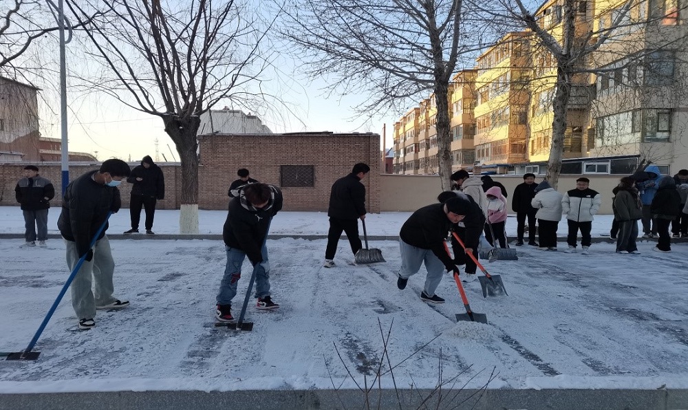 面对冰与雪的考验,行动是最好的融雪剂,为快速清除路面积雪,同学们带上铁铲、扫帚等工具,齐心协力,推、铲、堆,各种方法齐上阵,有条不紊地开展积雪清扫工作,在清理主要道路上的积雪的同时,同学们还温馨的提醒往来的师生注意出行安全和防寒保暖,为寒冷的冬天平添几分暖意。