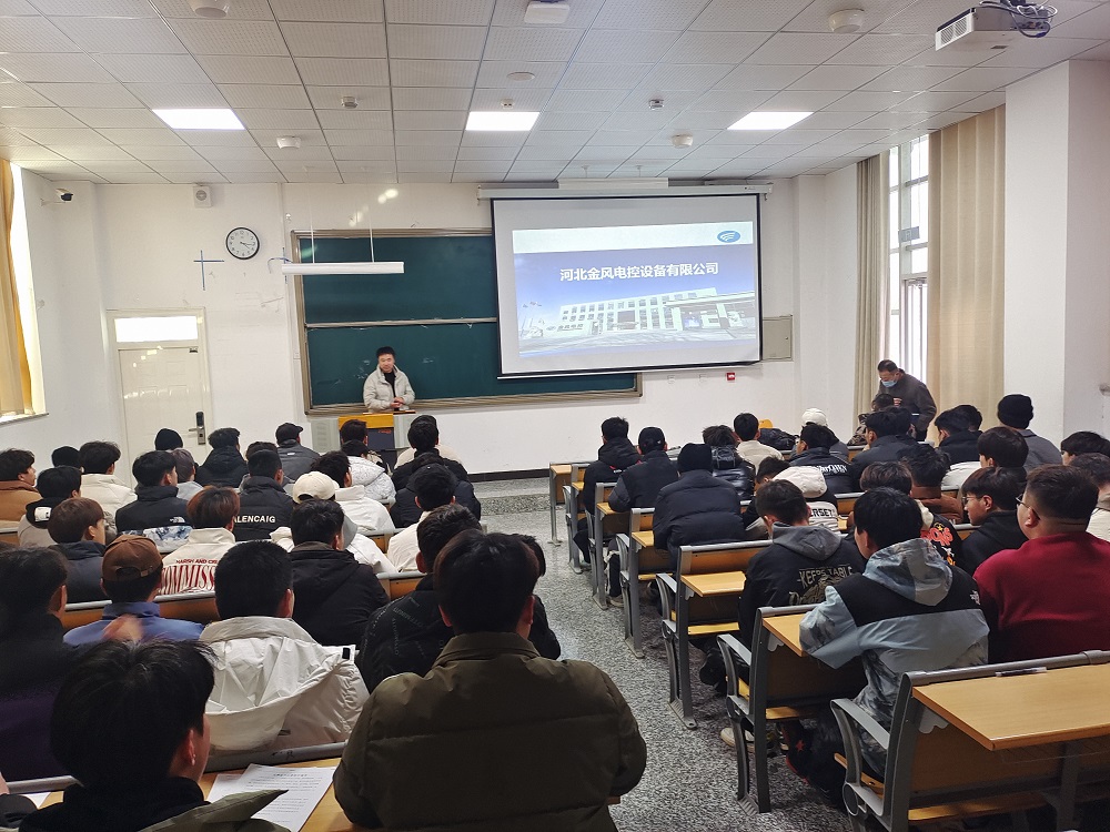 2024年1月2日,锐源风能技术有限公司、河北金风电控设备有限公司在学校致远楼东阶梯教室举办专场宣讲会;我院2021级、2022级风力发电工程技术专业130名学生参加。宣讲会上锐源风能人事经理胡福兴、河北金风木垒厂长李黎明分别对风电行业发展、公司发展情况、招聘工作岗位、员工待遇、员工职业生涯规划等方面做了详细介绍,并与部分同学们进行了互动交流。