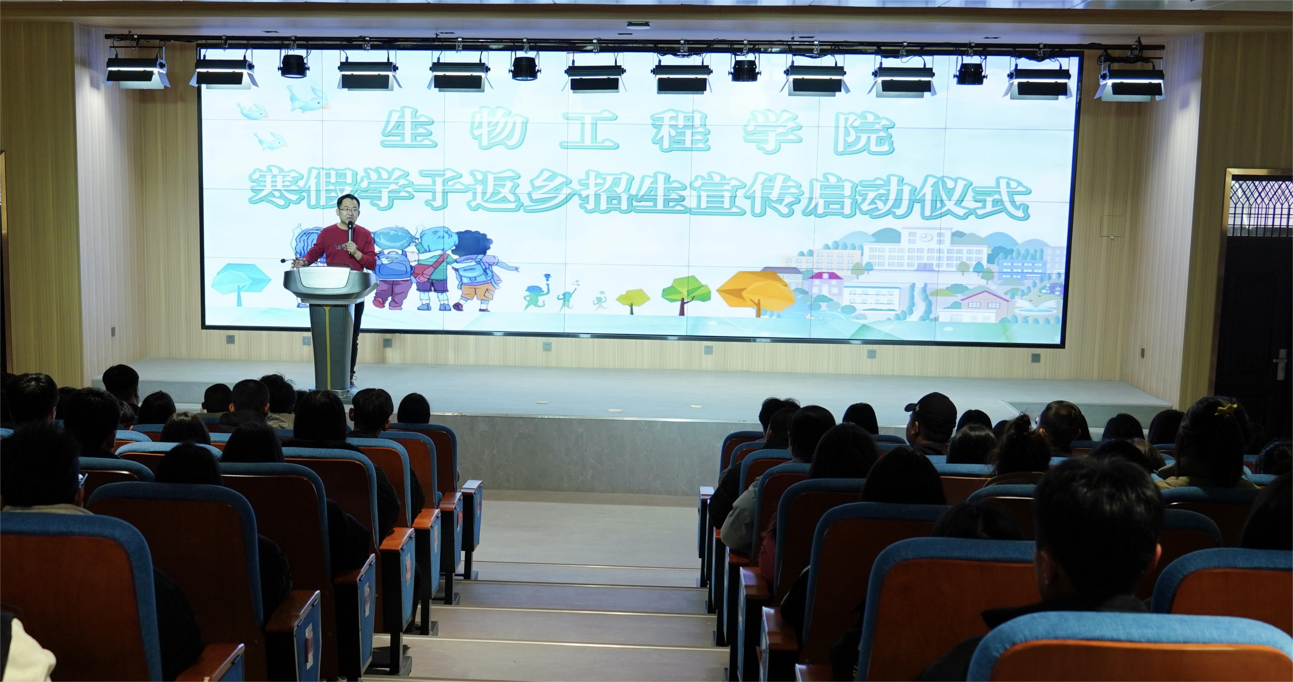为推进2024年招生工作有序实施,保障招生成果持续稳中向好。2024年1月4日,生物工程学院在弘毅楼闻道厅举行了寒假学子返乡招生宣传启动仪式。教师代表和200余名2023级招生宣传志愿者参加,仪式由庞捷副院长主持。