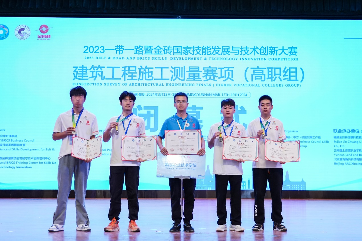 2024年3月16日-3月19日,“2023一带一路暨金砖国家技能发展与技术创新大赛”建筑工程施工测量赛项(高职组)国内决赛在云南国土资源职业学院举行。本次大赛土木工程学院组织四名同学共两支参赛队参加比赛,经过激烈的角逐,我校参赛队员在来自全国60所院校的110个参赛队中总分排名第13名和第19名,荣获二等奖两项,同时,我校获得优秀组织奖。