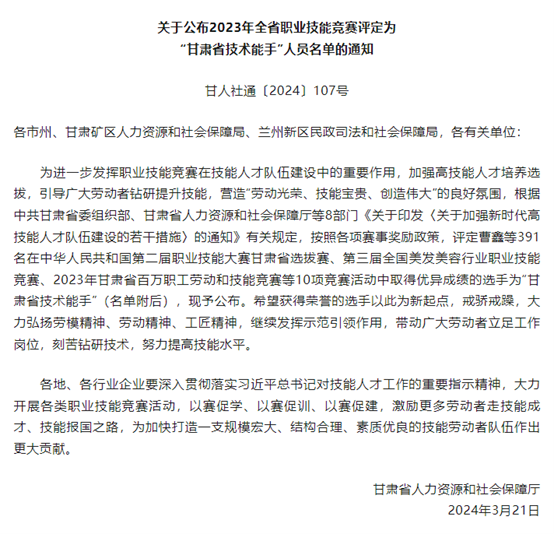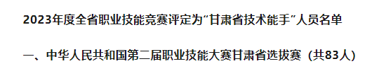 近日,甘肃省人力资源和社会保障厅发布了《关于公布2023年全省职业技能竞赛评定为“甘肃省技术能手”人员名单的通知》,机电工程学院2020级机械制造与自动化1班周阳东、2021级机械制造与自动化1班黄劲博、2021级智能焊接技术班姬江涛三人荣获“甘肃省技术能手”荣誉称号。