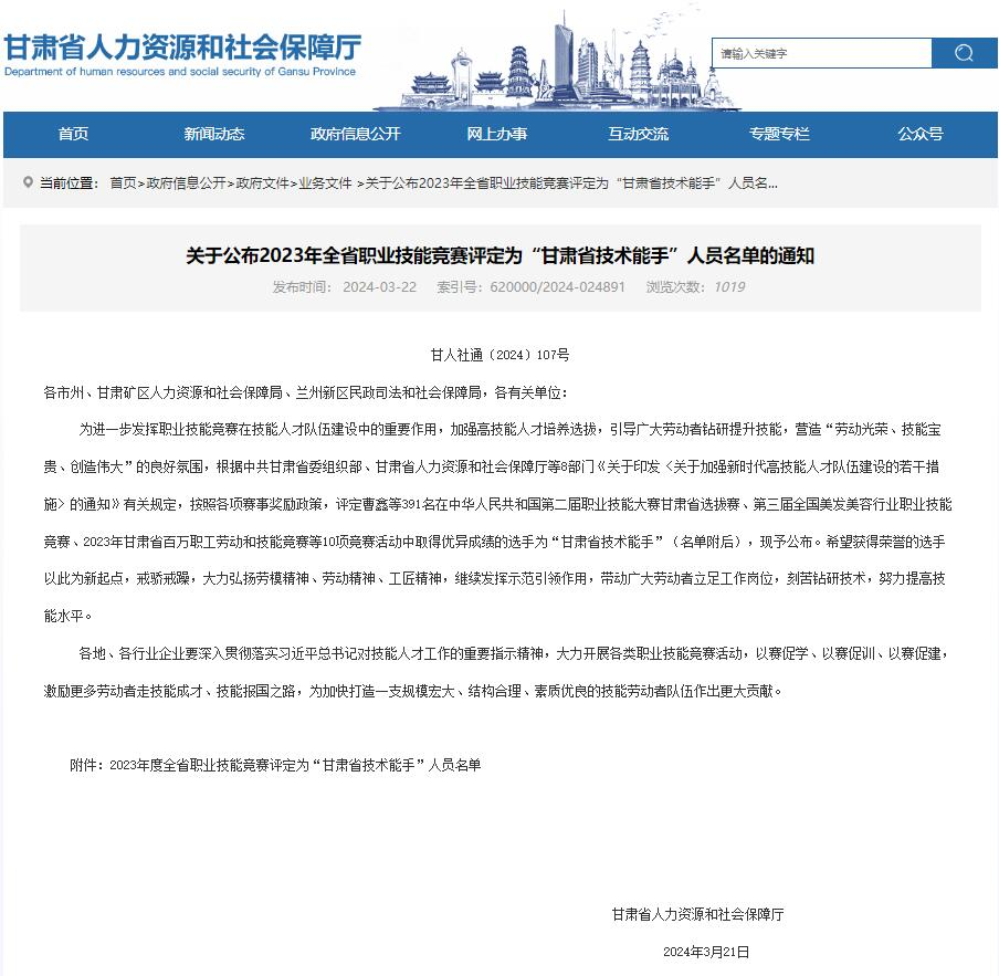 ----土木工程学院1人入选2023年全省职业技能竞赛“甘肃省技术能手”人员名单