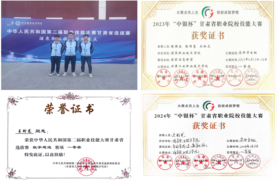进入大学以来,王盼龙同学始终保持着积极向上的心态,高标准严格要求自己,努力做到专业素养和技术技能全面发展。该同学先后在2023年甘肃省职业院校建筑信息模型赛项团体赛获得一等奖,2023年中华人民共和国职业技能大赛甘肃省选拔赛个人赛获得一等奖,2024年甘肃省职业院校市政管线(道)数字化施工团体赛获得一等奖,因其优异的成绩,曾被评为酒泉职业技术学院“陇原未来工匠”。此次获得“甘肃省技术能手”这项荣誉,是对王盼龙职业技术技能水平的肯定,也是对学校技能育人成果的肯定。