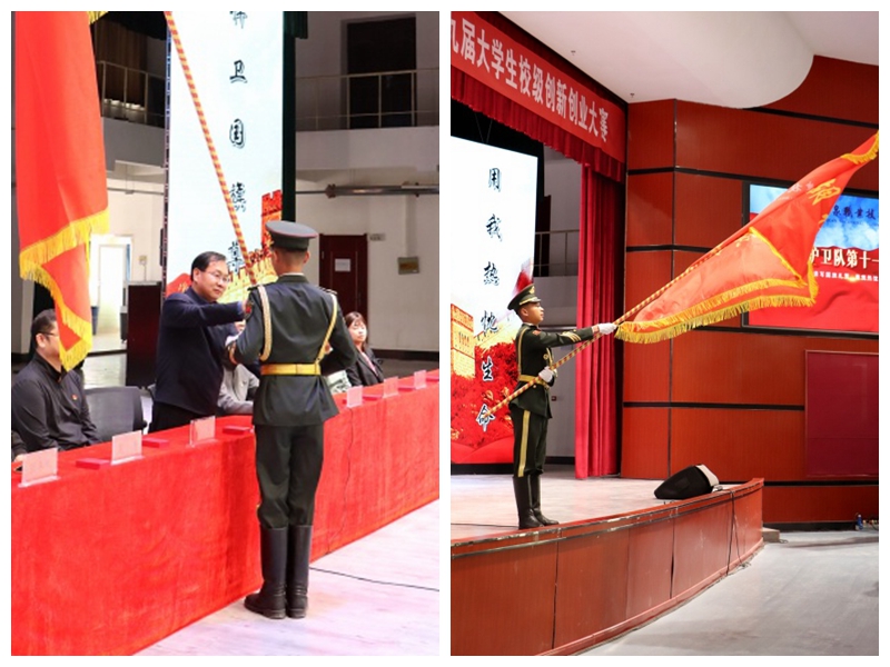 党委委员、副校长施荣向第十二届国护队授胡杨国旗护卫队队旗。