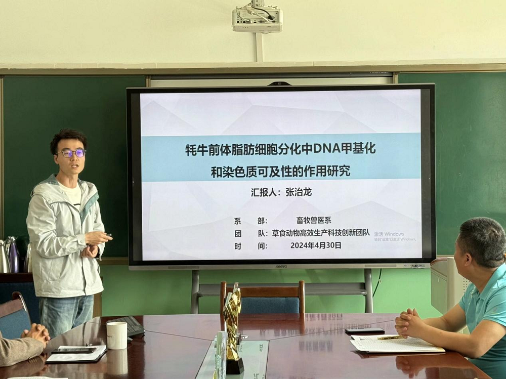 活动中,畜牧兽医系张治龙博士以创新团队为基础,结合自己读博期间的研究方向及内容,介绍了科技创新团队的研究方向,分享了有关“牦牛前体脂肪细胞分化中DNA甲基化和染色质可及性的作用研究”的学术成果。