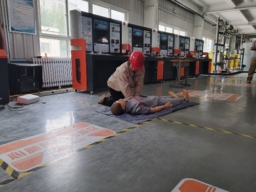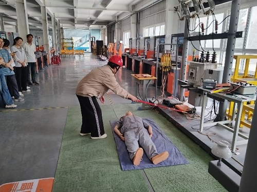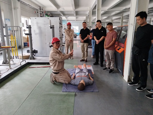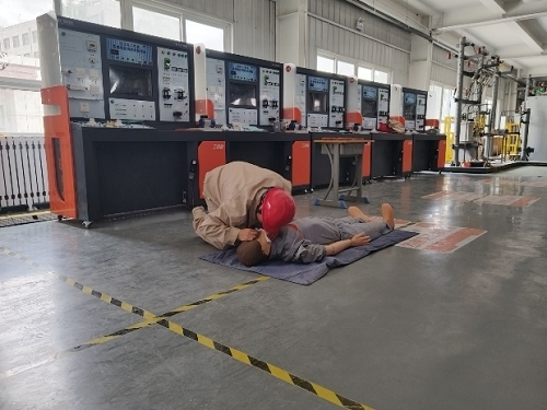 随后由教师韩寅龙、王智浩为大家介绍普及了触电急救知识,并分别模拟真实生产场景下发生的低压、高压设备人员触电现场,按步骤实现触电急救,包括挑开电线、关闭闸刀、移动人员,心肺复苏等。活动现场老师们积极踊跃的参与触电急救演练,更好地了解和掌握了触电急救知识。