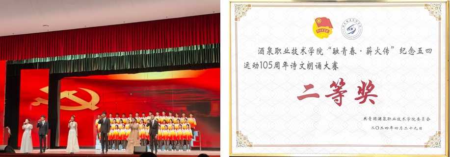 在学校隆重举办的“融青春·薪火传”纪念五四运动105周年诗文朗诵大赛中,我院学子以一曲慷慨激昂、深情并茂的《站起来的中国》脱颖而出,荣获二等奖,这一荣誉不仅是对他们个人才华与努力的认可,更是对我院学子传承五四精神、弘扬爱国情怀的生动诠释。我院将进一步加强对学生爱国主义教育和综合素质的培养,鼓励更多学子在传承与创新中不断成长,为祖国的繁荣富强贡献自己的力量。