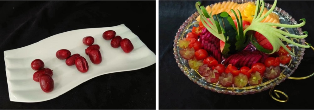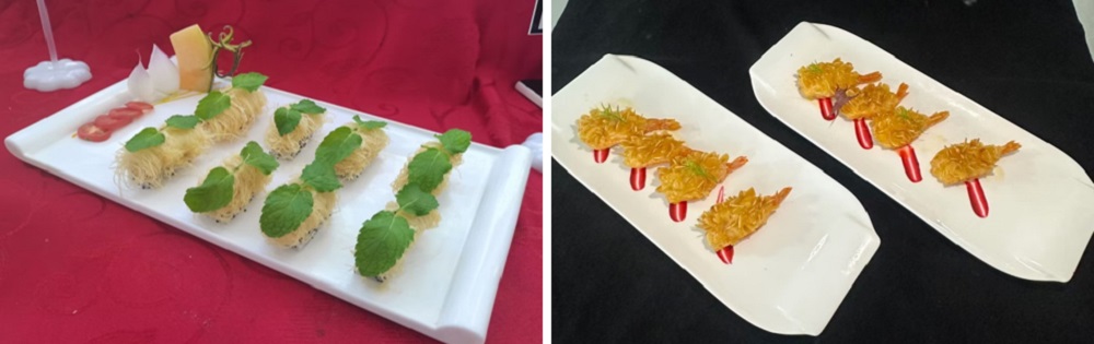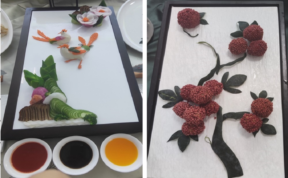 毕业设计全程学生从主题选择、食材选购、作品构思、成品制作和最终展示等多方面勤钻研。在专业老师的悉心指导下,同学们结合在校所学知识,充分发挥所学技能,花费数小时精心准备。制成的菜品色香味俱全,冷拼作品栩栩如生、活灵活现,摆盘精美,充分展现了学生们的烹调技艺、食品雕刻工艺、装盘艺术等专业技能,凝聚了同学们的智慧与心血,也蕴藏了烹饪专业教师们的谆谆教诲与耐心教导。其中,热菜类《糯香竹笋肉》、《吉祥如意》等作品精心烹饪、细致摆盘将食与型完美结合;冷拼类《百花争艳》、《鸟语花香》等作品造型精美,惟妙逼真;象形面点《枣生贵子》惟妙惟肖,将对宾客的美好祝愿融入面点。烹饪工艺与营养全体师生共同享受了一场视觉与味觉的美食盛宴。