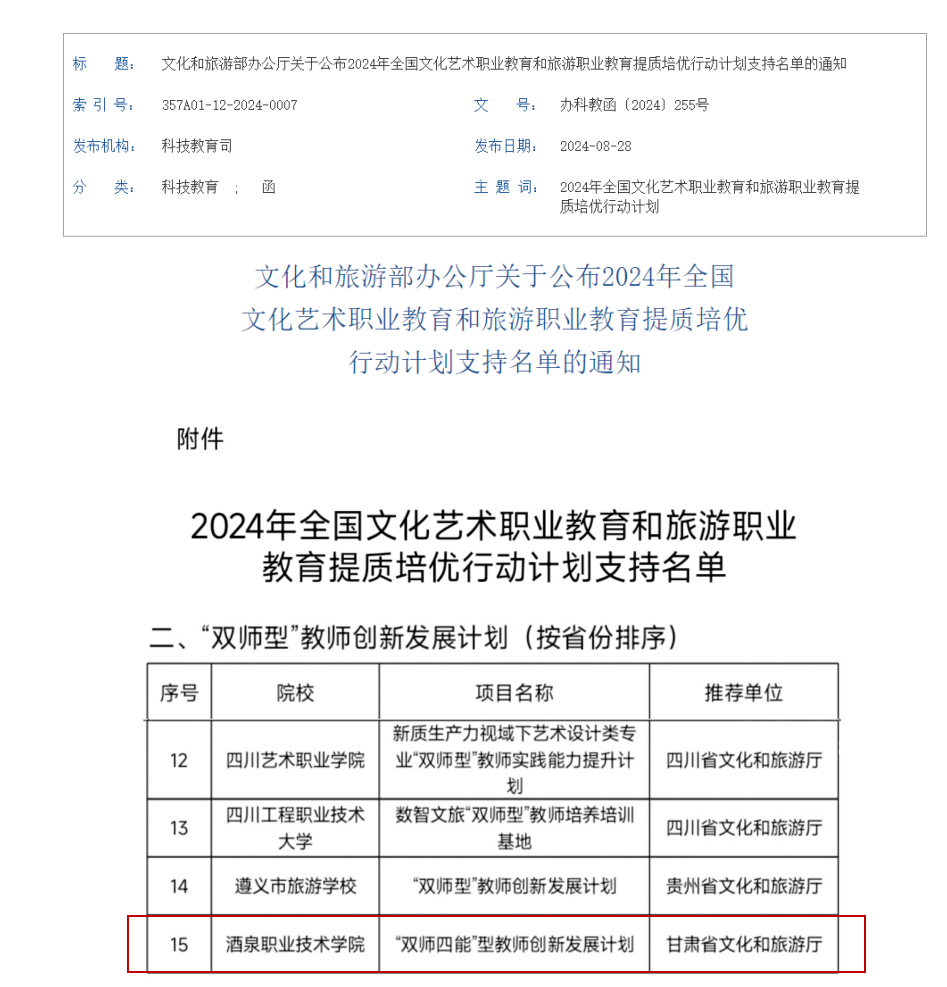 8月27日,文化和旅游部办公厅公布了《文化和旅游部办公厅关于公布2024年全国文化艺术职业教育和旅游职业教育提质培优行动计划支持名单的通知》,教育与艺术学院《“双师四能”型教师创新发展计划》项目成功入选。