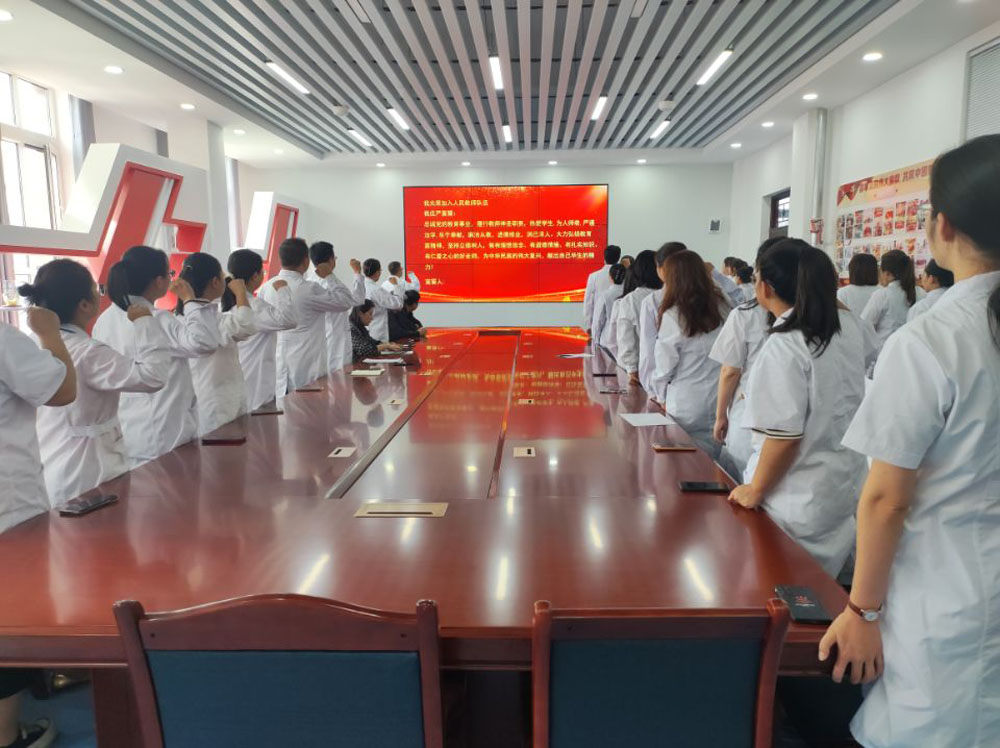 医学院党支部副书记段国萍为新入职老师佩戴了校徽,副院长杨文龙带领全体老师面向国旗进行庄严的入职宣誓仪式,提醒全体教职工,牢记立德树人初心使命,爱岗敬业,勤勉上进,为国育才,为党育人。