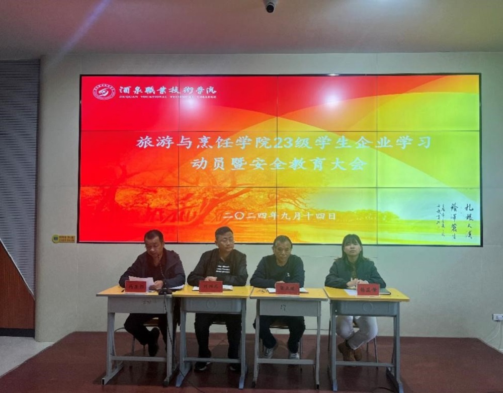 为帮助学生进一步明确企业学习的意义及要求,推动2023级学生赴企业学习工作的顺利开展,切实提高学生实践能力,9月14日下午,我院于行知楼东阶梯教室教室召开了2023级学生企业学习动员暨安全教育大会。旅游与烹饪学院院长刘兴龙、党支部副书记张来顺、马东邦副院长、杨蕊肇副院长及学院全体教师参与了此次安全检查活动,会议由马东邦副院长主持。