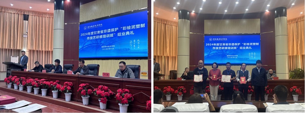 9月25日上午,2024年甘肃省非物质文化遗产传承人研培计划-彩绘泥塑制作技艺研修培训班作品展览暨结业仪式在酒泉职业技术学院隆重举行。酒泉市文体广电和旅游局党组成员、副局长陈锦业,酒泉职业技术学院党委委员、副校长王金明,酒泉市文体广电和旅游局四级调研员纪孟祥出席展览和结业仪式,仪式由酒泉职业技术学院旅游与烹饪学院党支部书记、院长刘兴龙同志主持,研培班全体学员和旅游与烹饪学院全体教师也参加了此次活动。