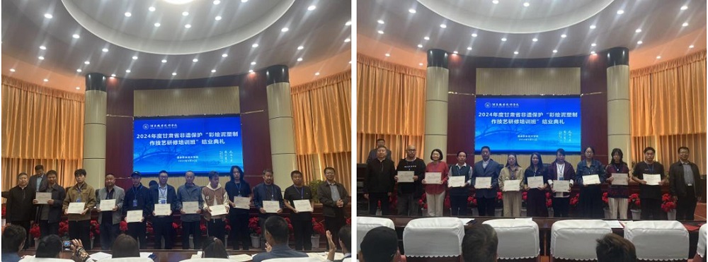酒泉市文体广电和旅游局党组成员、副局长陈锦业同志为研培班优秀学员颁发证书,王金明副校长和纪孟祥调研员为此次研培班学员颁发结业证书,这不仅是对学员们学习成果的认可,更是对大家肩负起非遗传承重任的激励。
