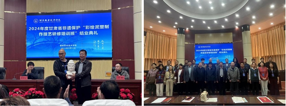 在结业仪式上,酒泉职业技术学院党委委员、副校长王金明同志对学员们在研培班中的学习与成长给予了充分的肯定。他指出,此次培训班为非遗传承人提供了一个学习交流的平台,通过系统的理论学习和实践操作,传承人在技艺水平、创新能力和传承意识等方面都有了显著提高。同时,他也对传承人提出了殷切期望,希望他们能够继续坚守传统,不断创新,将彩绘泥塑制作技艺传承下去,为推动中华优秀传统文化的创造性转化和创新性发展做出更大的贡献。