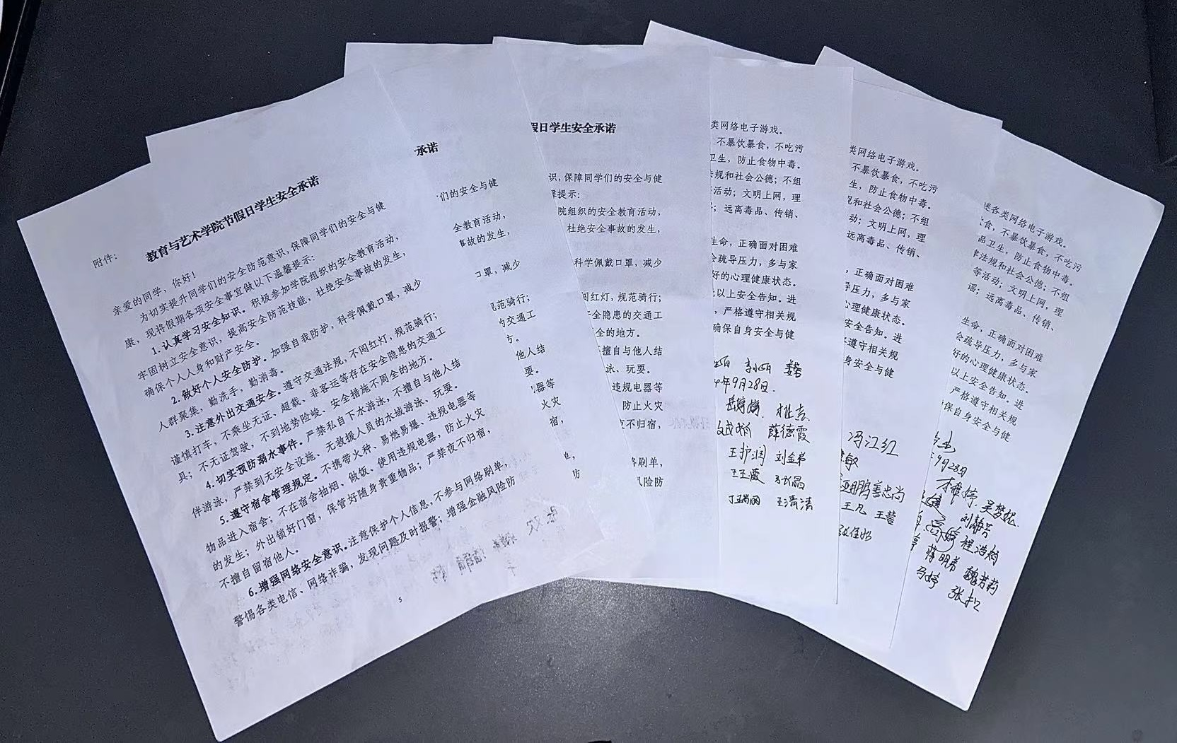 预防安全为主,强化安全意识。学院组织全体学生签署《教育与艺术学院节假日学生安全承诺书》,进一步强化师生安全防范意识和安全保护能力,切实做好“十一”期间学生安全教育管理工作,保障学生的生命安全和财产安全。
