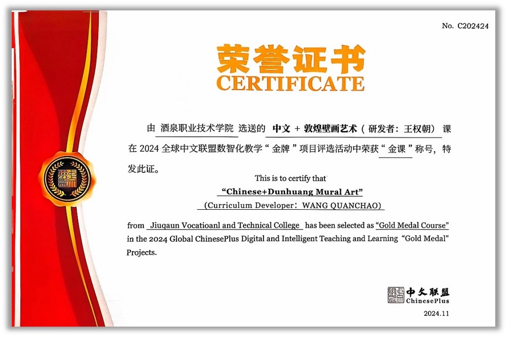 11月17日,由教育部中外语言交流合作中心、中国国际中文教育基金会、世界汉语教学学会共同承办的“2024全球中文联盟大会”在北京国家会议中心举办。由我校旅游与烹饪学院承担建设的《中文+敦煌壁画艺术》国际双语在线课程获评“全球中文联盟数智化教学金课”,本次大会共有来自国内外高校、教育机构的29门课程获评金课。