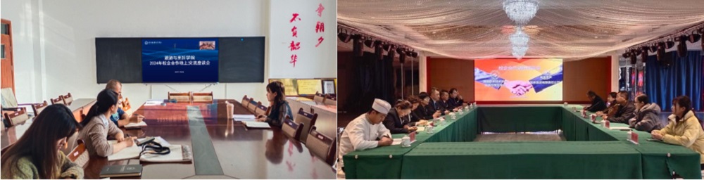 交流中,企业代表纷纷发言,分享了“4+1+2”实践教学、“企业生产项目进课堂”方面的成功经验和未来规划。与会代表们基于烹饪工艺与营养、酒店管理与数字化运营的专业特点,围绕“如何精准对接企业需求,优化人才培养体系”、“创新校企合作模式,提升实践教学质量”、“打造高质量产教融合课程”等议题展开了热烈讨论。双方代表纷纷提出建设性意见,并就具体合作项目进行了初步探讨和规划,希望通过实习实训、课程共建等多种方式,实现资源共享、优势互补,共同促进教育与产业的深度融合,现场气氛热烈融洽。与额济纳旗金源和天下文化旅游股份公司、内蒙古誉颢旅游有限公司、敦煌国际酒店等企业的线上座谈中,校企双方总结交流了前期企业实践教学的经验与不足,明确了下一步改进的方向;与酒泉饭店有限责任公司、酒泉万禧国际酒店线下座谈中,结合前期开展的“4+1+2”实践教学,校企双方结合企业行业需求和人才培养,深入研讨了“把课堂搬进企业”提升推广项目进一步优化提升的路径,结合学生实践能力提升和校企合作育人对“企业生产项目进课堂”阶段性成果与不足进行了总结。