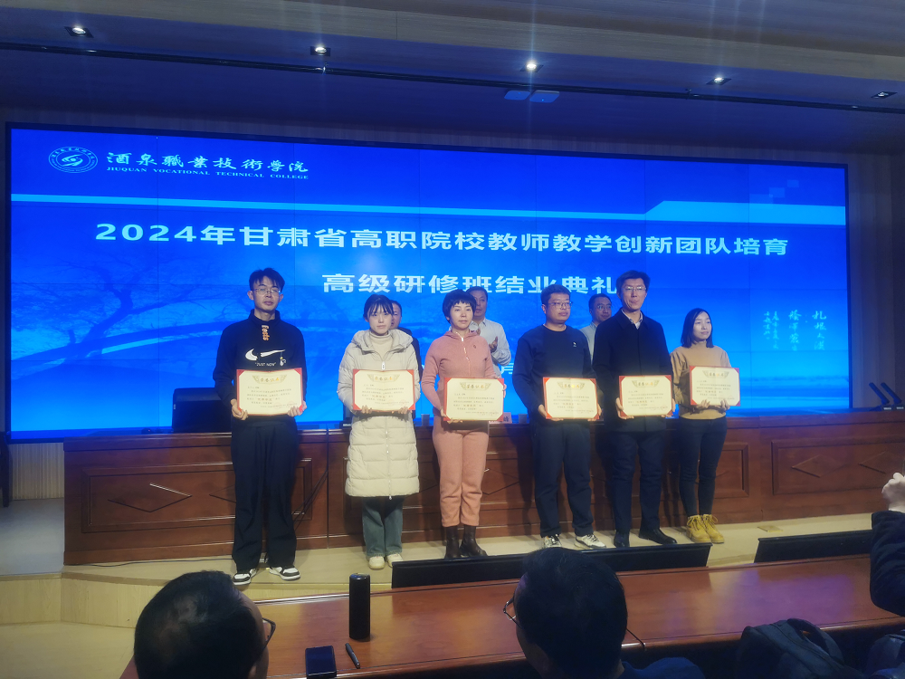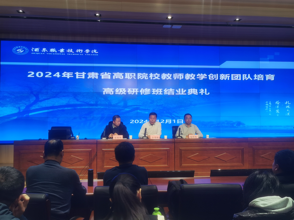 12 月 1 日下午,2024年“国培计划”甘肃省高职院校教师教学创新团队培育高级研修班结业典礼在酒泉职业技术学院弘毅楼启明厅隆重举行。酒泉卫生学校党委委员副校长,酒泉职业技术学院合作发展处处长、甘肃省职教师资培训基地办公室主任孙俊峰,新能源工程学院领导班子以及来自各高职院校的 100 名培训学员共同出席了典礼。典礼由酒泉职业技术学院新能源工程学院党支部书记、院长程明杰主持。