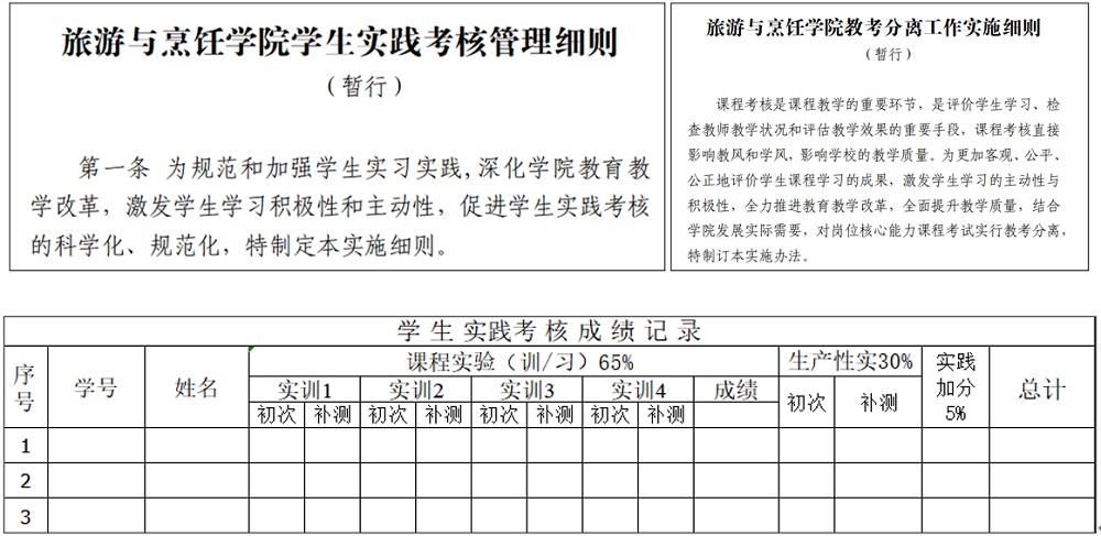 依据学情“量身定做”的多种评价方式,制定《旅游与烹饪学院学生实践考核管理细则》,采取综合能力评价与单项能力评价相结合、纸笔测试评价与实践活动评价相结合、课内评价与课外评价相结合的评价方式,依托酒泉同合顺大酒店、额济纳旗金源和天下文化旅游股份公司等多家企业合作开展的“企业生产项目进课堂”项目,将《烹饪基本功训练》《中餐烹调技术》《研学旅行课程设计与实践》《前厅服务与管理》《甘肃导游》24门课程,结合岗位典型工作任务、工作过程对岗位实际需求的知识点、技能点进行项目化重构,在课程实践考核中将考核项目岗位化、考核方式竞赛化、考核标准企业化。将每次实训中的一次终结评价优化为三次评价、选择最优评价,引导唤醒学生自我教育、自我学习内生动力;将校内生产性实训、结合专业教学开展的实践活动按比例折算,计入学期岗位核心能力课程实践成绩,引导学生走向德智体美劳全面发展,提高了评价质量,焕发了评价活力。同时细化《旅游与烹饪学院教考分离实施细则》,每学期抽取10%专业核心课程进行考教分离重点观测,促使教师自觉地按照课程标准教学,学生树立端正的学习态度,形成重教重学的良好氛围,不断提高教学质量。