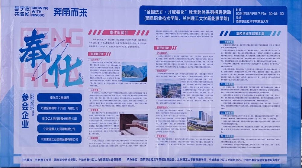 院系动态 > 正文12月19日,宁波市奉化区人才中心携区内优质企业走进酒泉职业技术学院,举办了“全国选才・才赋奉化”秋季赴外系列招聘活动专场招聘会,吸引了旅游与烹饪学院、经济管理学院、土木工程学院学生踊跃参与。此次招聘会为校企双方搭建了高效的沟通桥梁,促进了人才资源的精准对接与交流合作。