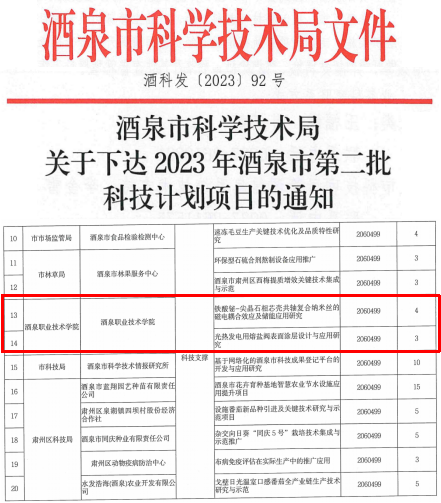 以平台支撑人才发展,以项目激发人才活力,以实践提升人才创新能力,今年以来,重点实验室团队成员1人被评为甘肃省领军人才,1人被评为甘肃省陇原青年英才,1人被聘为甘肃省科技专员,4人被评为酒泉市领军人才,4人被聘为酒泉市科技特派员,依托重点实验室支持,培养已毕业博士2名,在读博士4名。团队成员参与建设的新能源发电技术教师团队入选教育部第三批“全国高校黄大年式教师团队”,助力学校中国特色高水平高职学校和专业群建设计划项目顺利通过国家教育部验收,重点实验室人才培养效果逐渐显现,为“强科技”行动提供了有力保障。