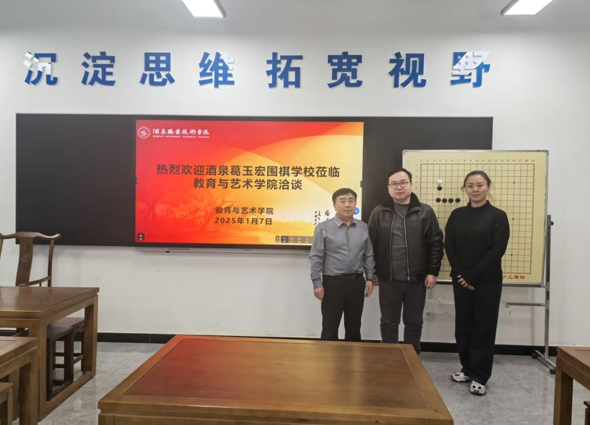 酒泉职业技术学院与杭州葛道纹枰文化传播有限公司自2017年携手以来,共同实施了“学前教育专业+围棋”产教协同育人机制,实现了“学前教育专业+幼儿围棋师资”特长学生的高质量就业。为进一步加强合作,2025年1月7日,酒泉葛玉宏围棋学校校长王多尚应邀莅临教育与艺术学院,开展了半天考察交流座谈。双方结合各自优势与需求,就“如何开展特色课程共建”、“怎样适应市场需求开展教学”、“如何建立人才培养联动机制”、“继续深化项目合作”等方面达成了共识。