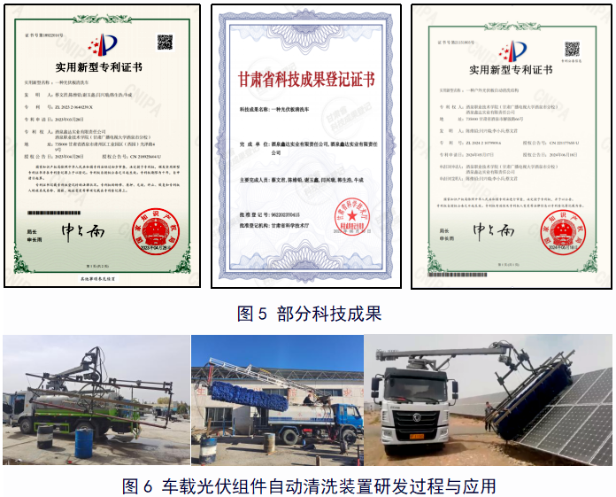 近年来,团队与鑫达实业的合作,已取得一定的成效。双方联合开展的“车载光伏组件自动清洗装置”研发与应用,已获得甘肃省中小企业创新基金、酒泉市科技支撑计划项目等的资助;开展的“风力发电机组刹车盘在线修复技术”研发工作,获得肃州区科技支撑计划和市领域产教融合联合体项目的资助。现申请相关专利10项,登记省级成果4项。
