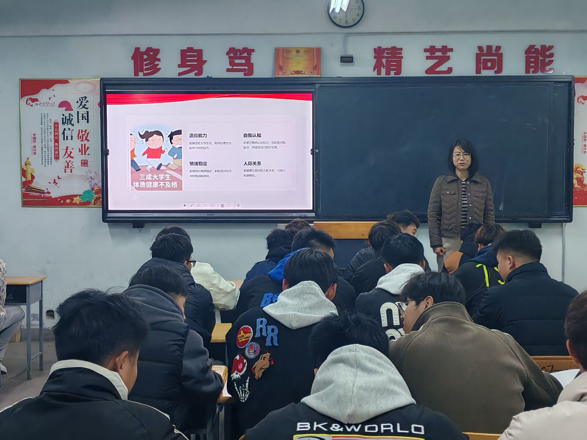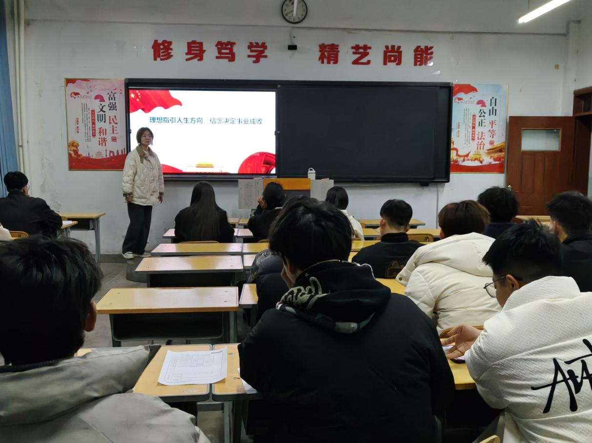 主题班会上,班主任老师激励同学们树立远大理想,坚定专业信念,并结合学校规章制度、安全注意事项,对纪律遵守、人生财产安全、日常行为规范等方面提出了要求。
