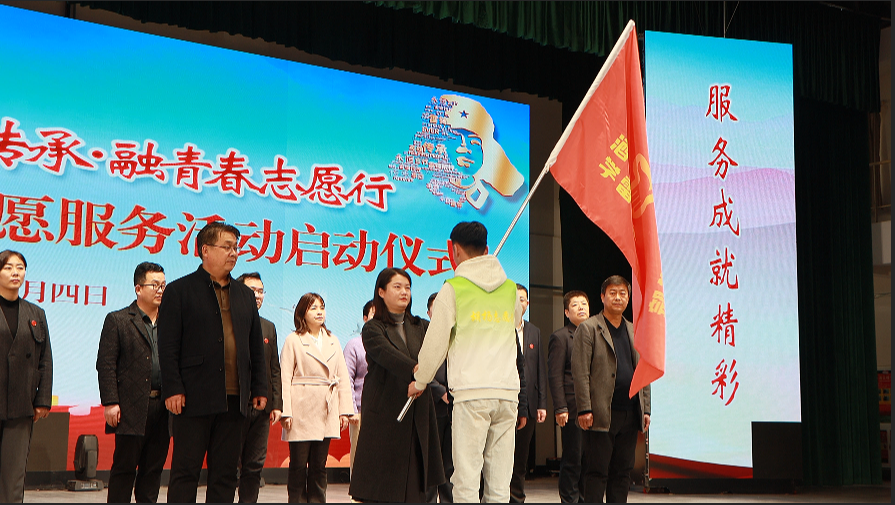 仪式上李亚敏向学校学雷锋志愿服务队授旗。