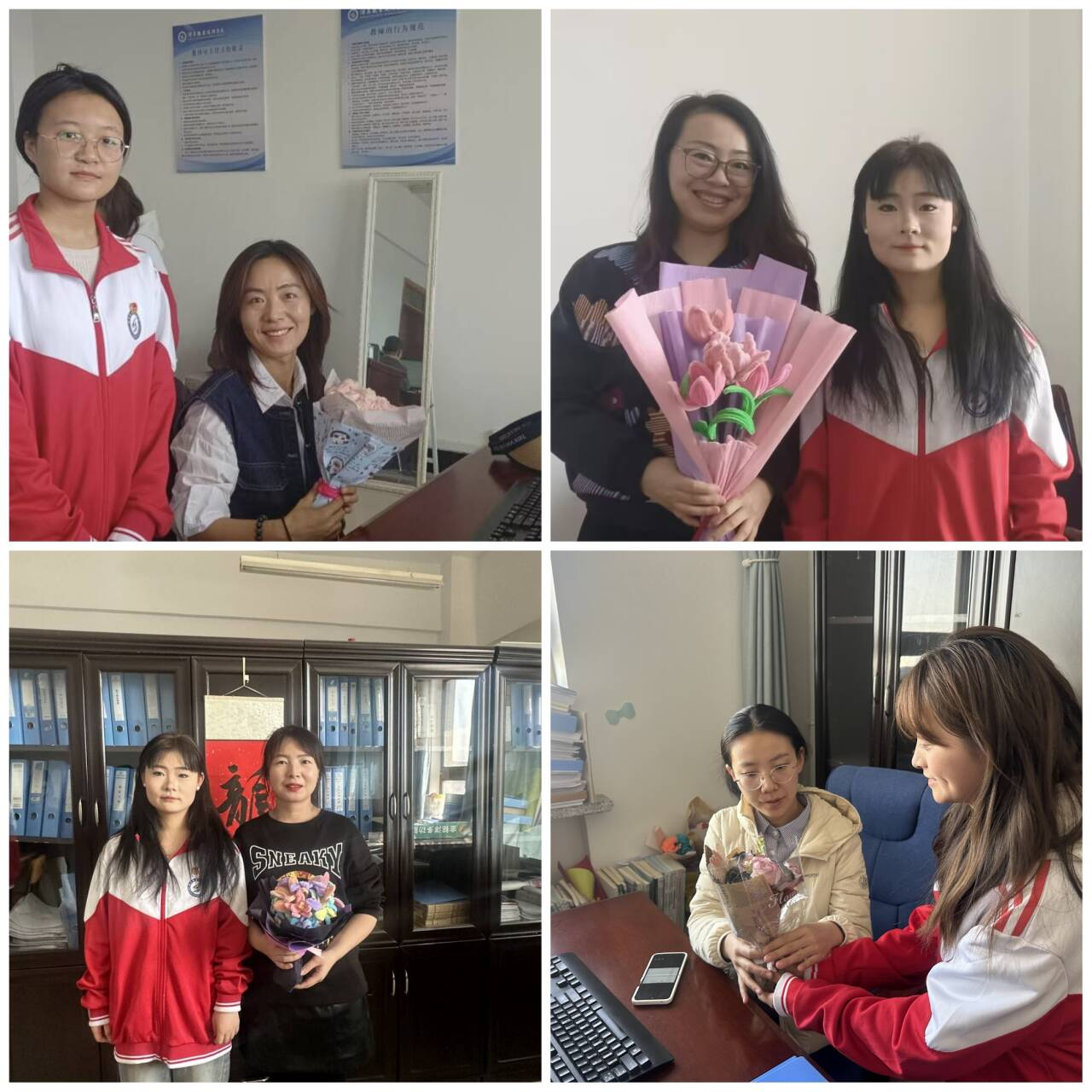 鲜花赠师,手作传情。学生志愿者自发组织“手作鲜花谢师恩”活动。学生们提前制作了康乃馨、向日葵等手工花束,并附上手写贺卡。活动现场,学生代表将花束逐一送到教师手中,向在场女教师送上节日祝福。