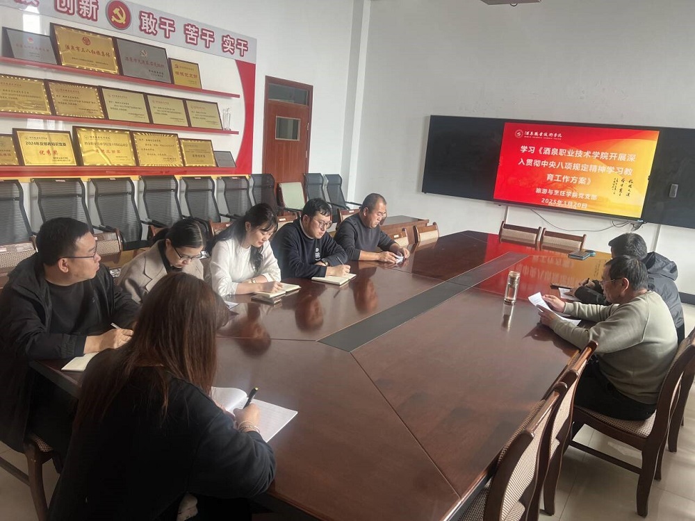 会上,支部副书记领学了《酒泉职业技术学院开展深入贯彻中央八项规定精神学习教育工作方案》;支部书记刘兴龙结合中央八项规定精神的核心内容及违反规定的具体表现,重点剖析了违规公款吃喝、公务接待超标、差旅费用转嫁等突出问题,强调党员干部需以案为鉴,对照自查自纠,严守纪律红线;结合学院实际,部署了学习教育计划,要求通过集中研讨、案例警示、撰写心得等方式,推动八项规定精神内化于心、外化于行。