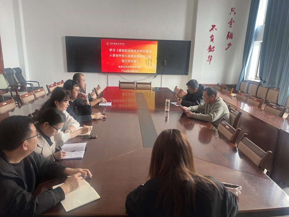 为全面落实全面从严治党要求,深化党风廉政建设,旅游与烹饪学院党支部于3月20日下午组织全体党员专题学习《酒泉职业技术学院开展深入贯彻中央八项规定精神学习教育工作方案》,结合强化纪律意识,筑牢思想防线。