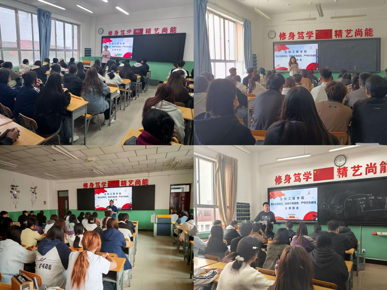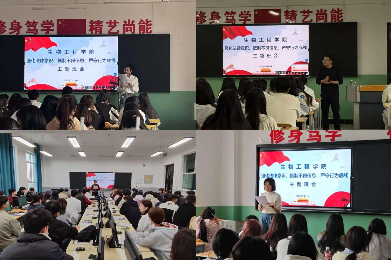 为进一步强化学生安全意识,筑牢校园安全防线,积极响应学校关于加强学生安全教育的号召,3月25日,生物工程学院组织全体班主任召开以“强化法律意识,抵触不良信息,严守行为底线”为主题的学生安全警示教育班会,全方位、多角度普及法律知识,切实提升学生安全防范能力,覆盖学院全体学生。