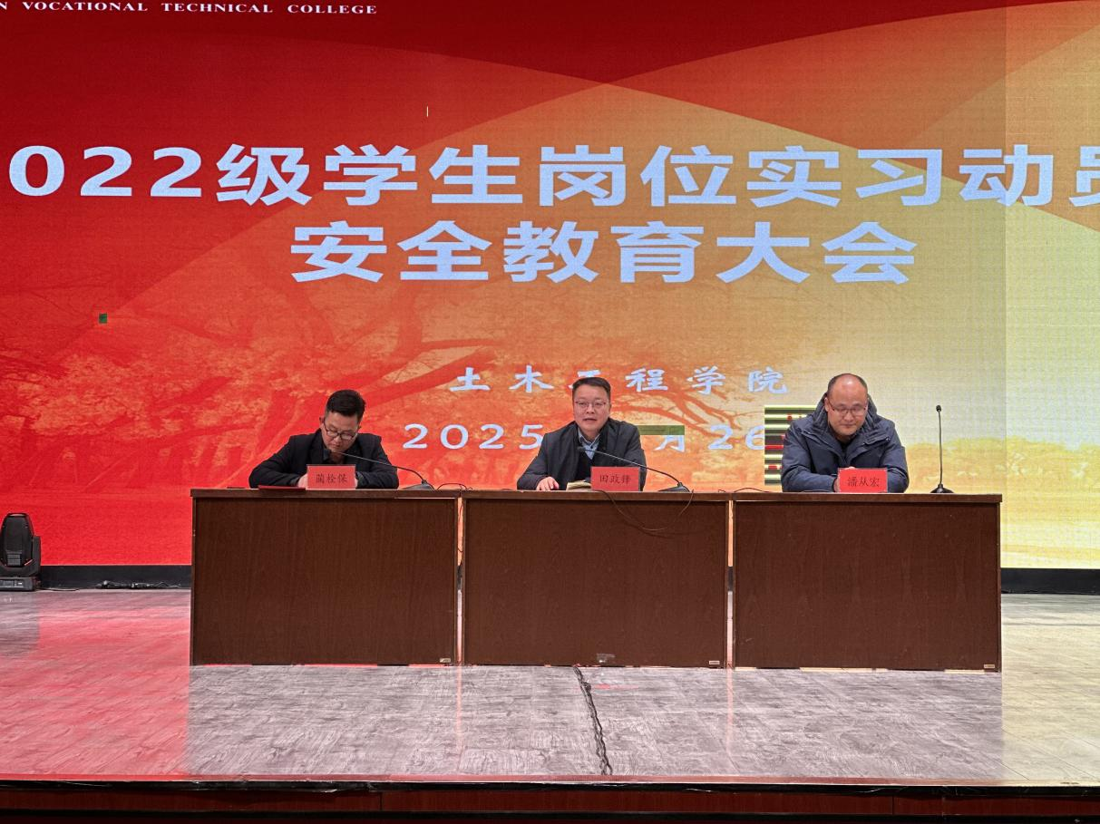 为深入贯彻落实教育部等八部门印发的《职业学校学生实习管理规定》和《甘肃省职业学校学生实习管理办法(试行)》等文件精神,切实做好2022级学生岗位实习工作,提高学生对实习重要性的认识,强化实习期间的安全防范意识。3月26日,土木工程学院在胡杨文化活动中心举行2022级学生岗位实习动员暨安全教育大会。会议由副院长蔺栓保主持,全体2022级实习学生、毕业班班主任及实习指导老师参加了会议。