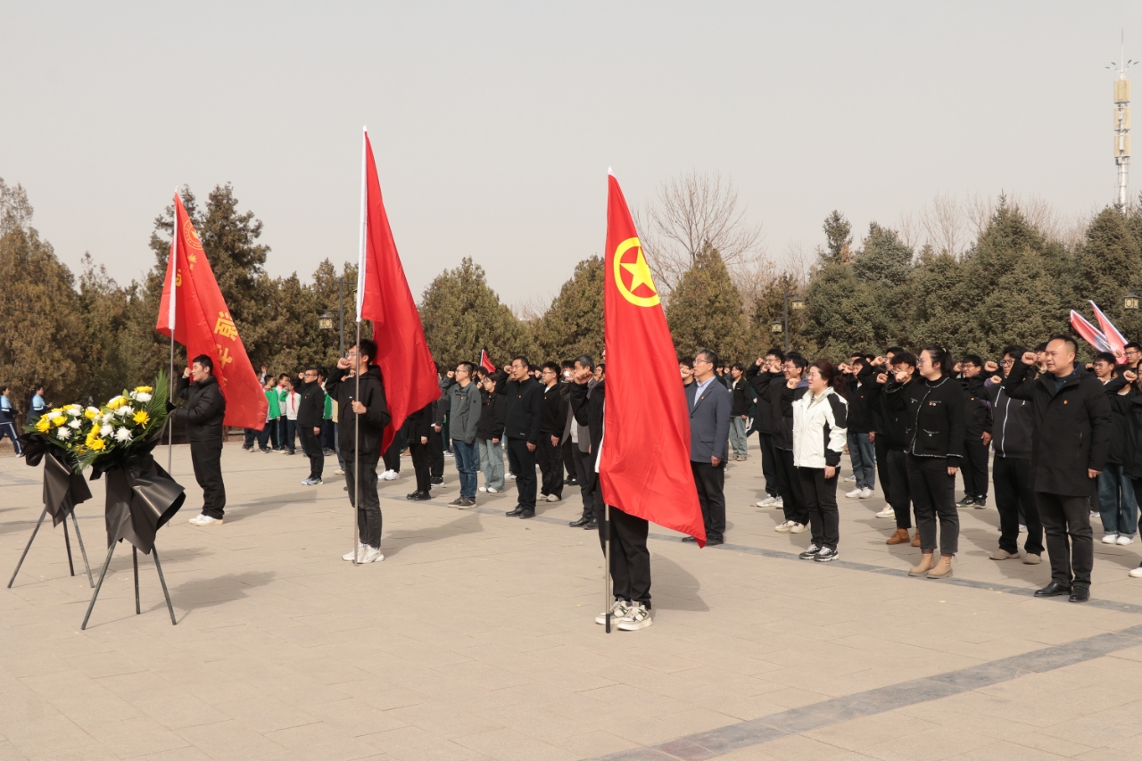 在庄严肃穆的烈士纪念碑前,全体教师整齐列队,神情凝重肃立默哀。党员代表向长眠于此的革命先烈敬献花篮,全体人员三鞠躬致以崇高敬意。面对鲜红的党旗,全体党员高举右拳重温入党誓词,铮铮誓言展现了新时代教育工作者赓续红色血脉、践行初心使命的坚定信念。