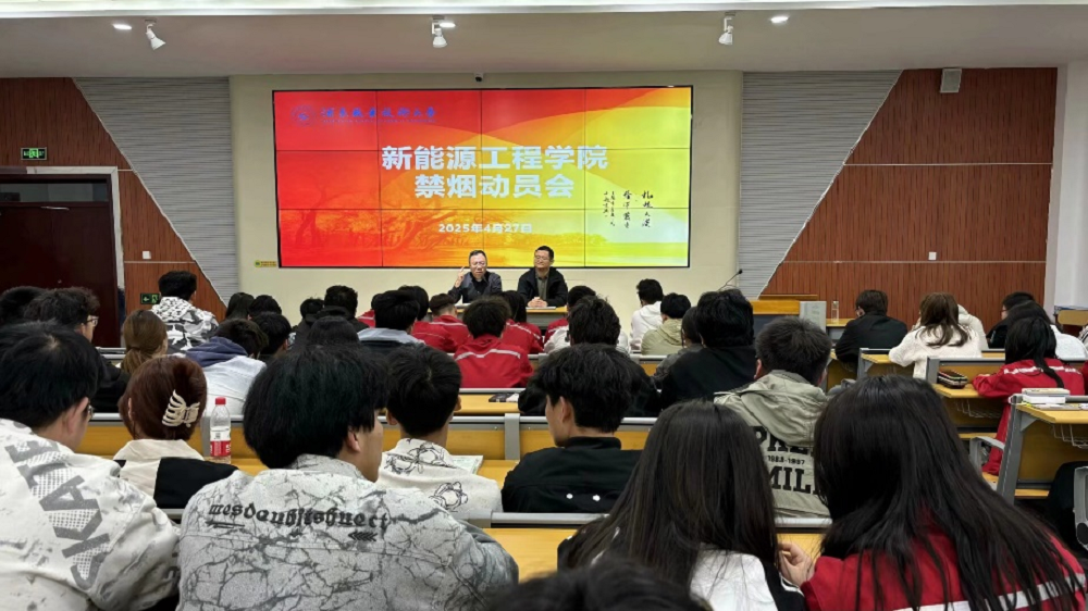2025年4月27日,新能源工程学院在行知楼1楼东阶梯教室开展了禁烟动员大会,学院党支部书记、院长程明杰,党支部副书记李亮及各宿舍舍长、学生干部等340名学生参会。