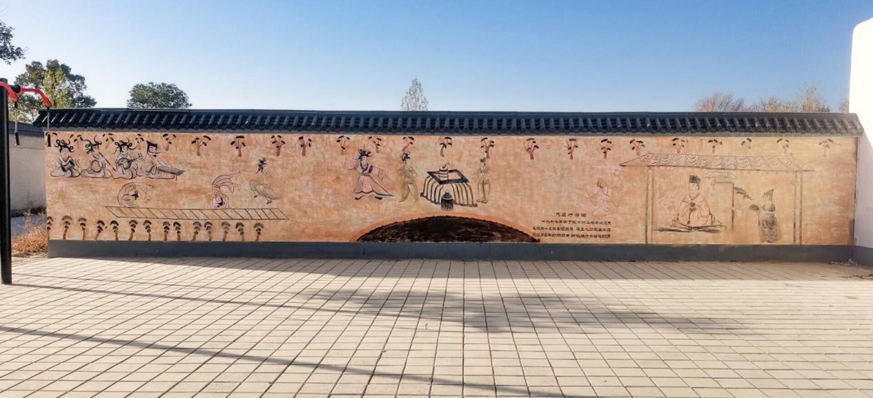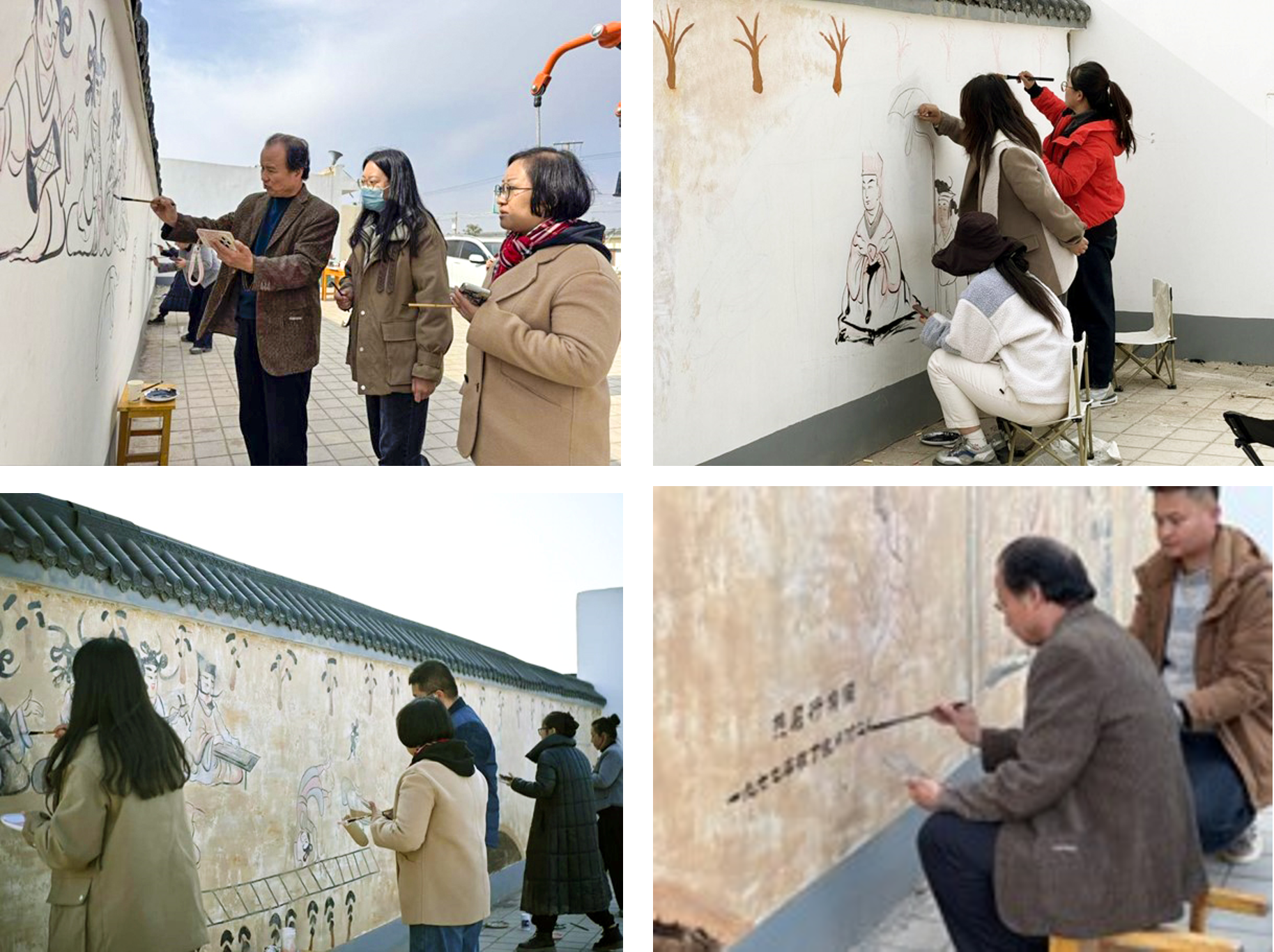 研学后,团队即刻启动艺术实践。创作以活动主题为导向,核心是将已保护、暂不对外展示的丁家闸壁画《燕居行乐图》,以墙绘形式“搬”到村公共墙面。在高立武副教授统筹下,团队先对照资料敲定还原细节,再按流程分工:一组负责墙面打磨与底妆铺设,保障持久牢固;其余组专注线条勾勒与色彩晕染,力求再现古画神韵。历时数小时,一幅兼顾原作风貌与户外展示的墙绘落成,既让村民及文化爱好者无需进墓感受壁画魅力,也为乡村增添了传递本土文化的鲜活景致。