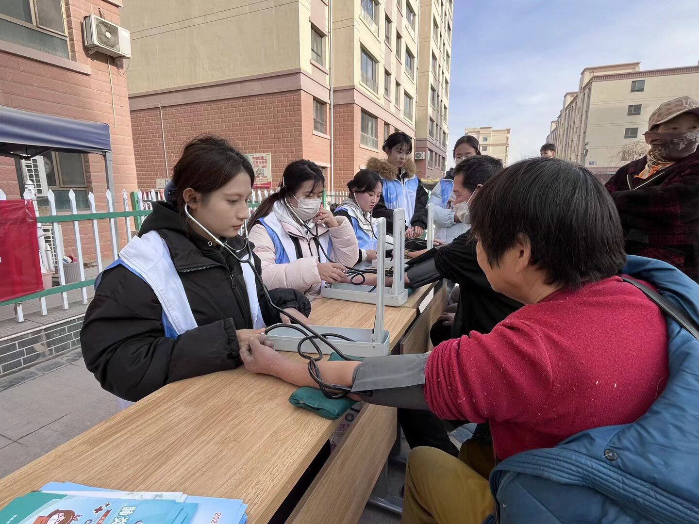 活动现场,志愿者们依托所学专业知识,在社区广场设立了便民义诊服务点,为往来居民提供专业的血压测量服务。志愿者们一边测量,一边耐心解答居民关于高血压防治、日常保健等方面的问题,细致周到的服务赢得了居民的连连称赞。