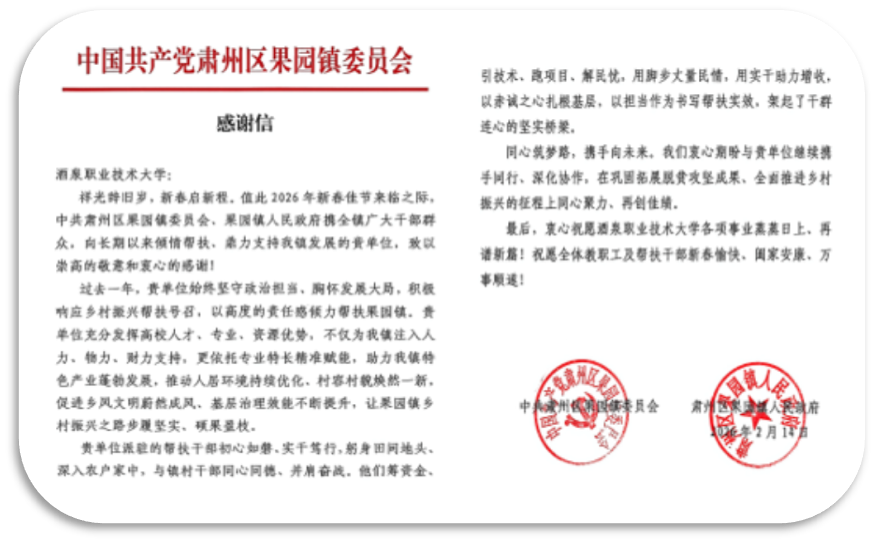 酒泉职业技术大学始终将乡村振兴帮扶工作作为重要政治任务,深化“党建引领 + 专业赋能 + 长效联动”工作模式,结合办学特色为帮扶村量身定制发展方案。此次感谢信不仅是对学校帮扶工作的肯定,更是对学校持续做好乡村振兴工作的激励。学校将以此为契机,继续发挥高校优势,深化校地合作,精准对接地方发展需求,以更实举措助力果园镇乡村全面振兴,让校地协同之花在乡村振兴一线持续绽放。