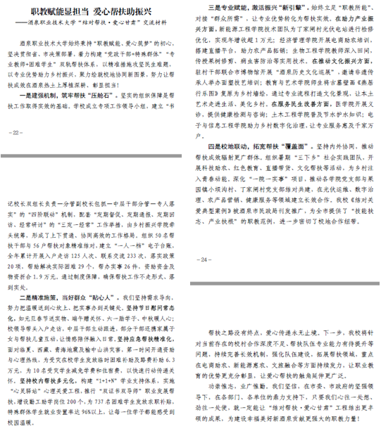 近日,《酒泉结对关爱行动工作专报》(第3期)刊发《职教赋能显担当爱心帮扶助振兴 —— 酒泉职业技术大学 “结对帮扶・爱心甘肃” 交流材料》,系统报道学校以职业教育特色赋能结对帮扶、助力乡村振兴的实践经验与成效,为全市结对关爱工作提供了可借鉴的职教范例。