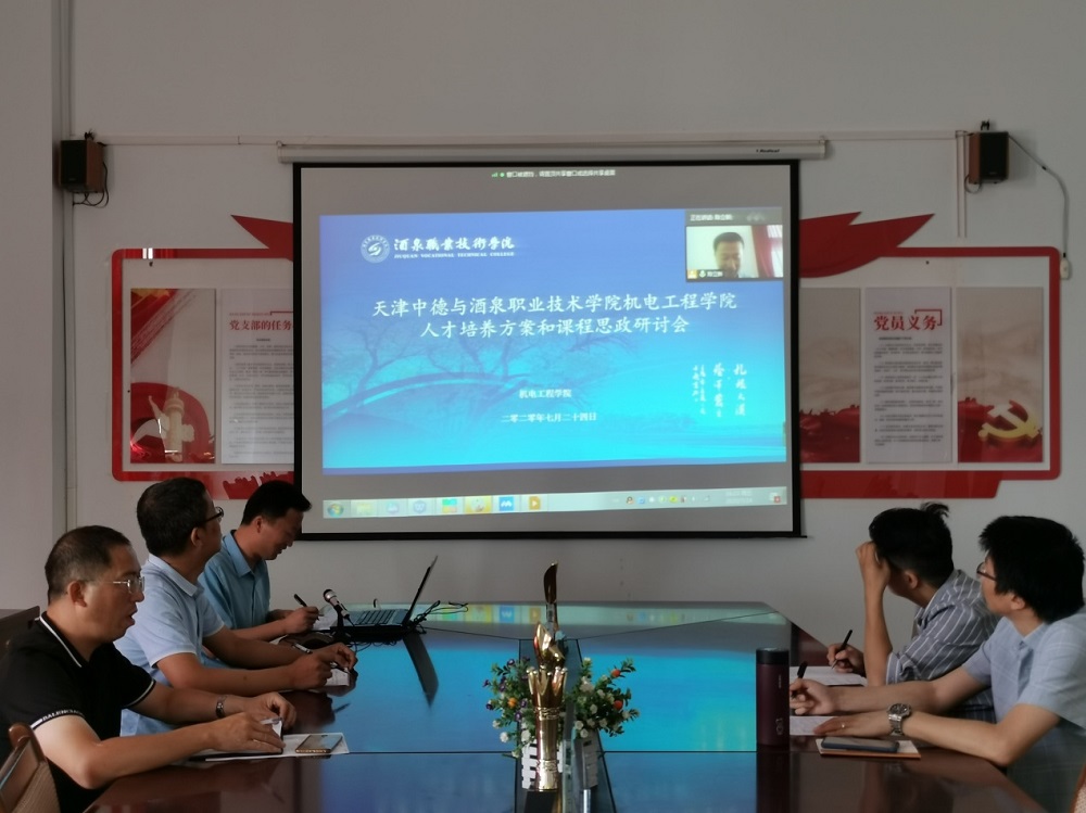 为贯彻落实《国家职业教育改革实施方案》、《高等学校课程思政建设指导纲要》等文件精神,以“办出特色,争创一流”为目标,推动人才培养、专业建设、科研水平发展,提升教师专业能力,探索构建优质教育资源互利共享的合作机制,7月24日机电工程学院邀请天津中德应用技术大学姜绍忠教授远程开展专业建设交流会,学院副院长赵吉虎老师向姜绍忠教授介绍了我院专业建设和课程思政建设情况。