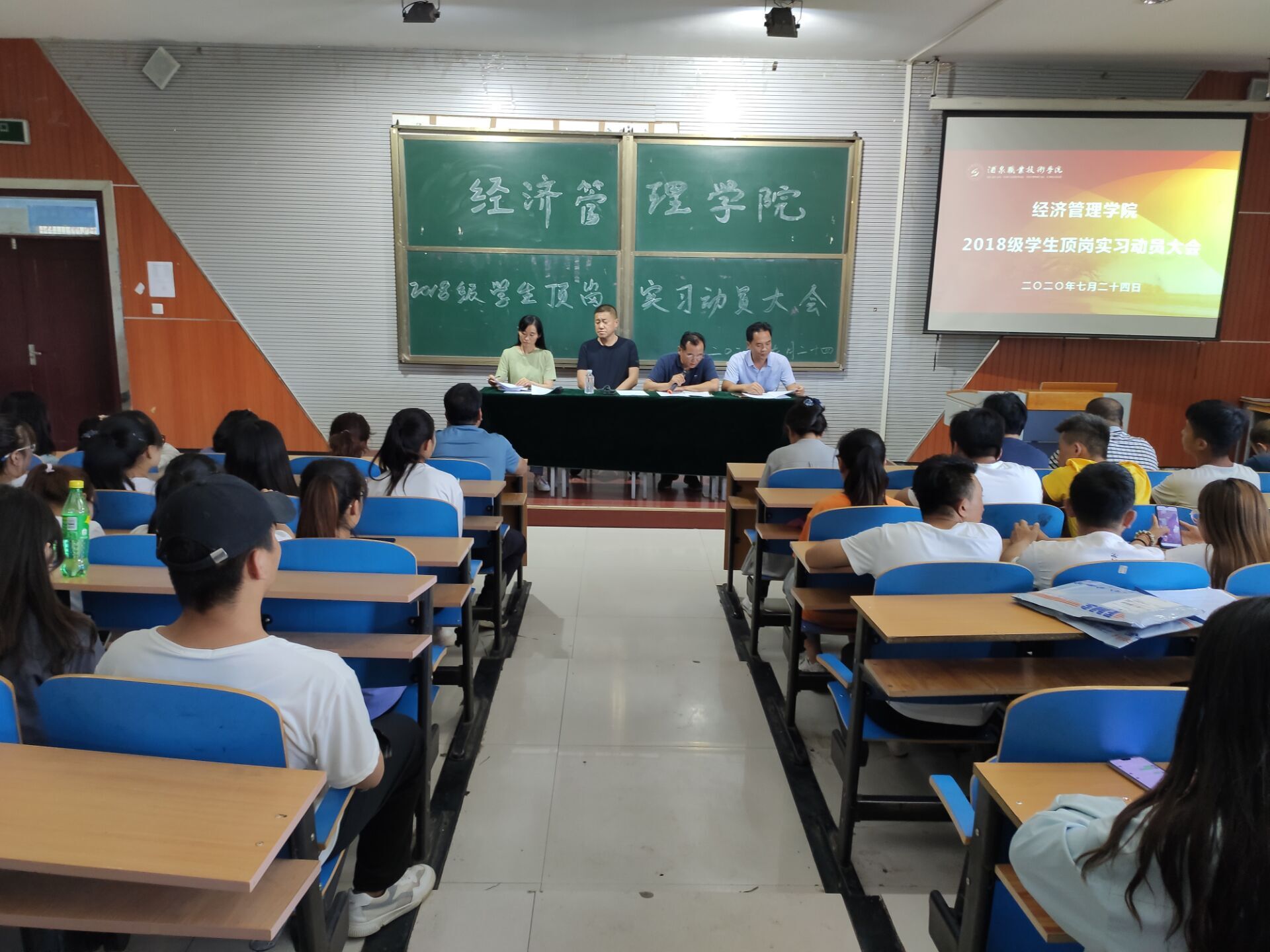 2020年7月24日下午17时,经济管理学院在行知楼西阶梯教室召开 2018级学生顶岗实习动员大会。学院领导班子成员,全体实习指导教师及2018级全体学生参加了大会。大会由副院长薛克光主持。