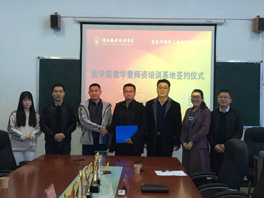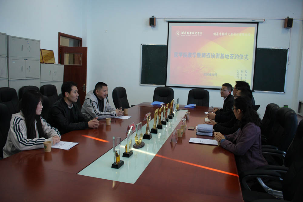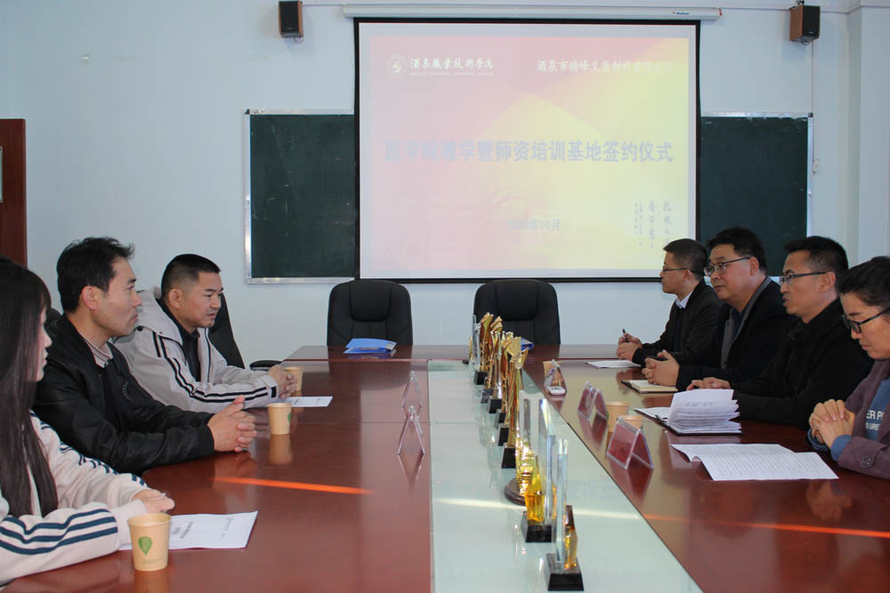 为加强校企之间的合作交流,寻找产教融合新思路,提高教学质量,10月21日下午,医学院与酒泉市精峰义齿制作有限公司在学院行知楼704会议室进行了医学院教学暨师资培训基地合作签约仪式,酒泉市精峰义齿制作有限公司总经理吴水强、厂长李贺强一行3人及医学院党支部书记、院长范玉敏等出席本次签约仪式。